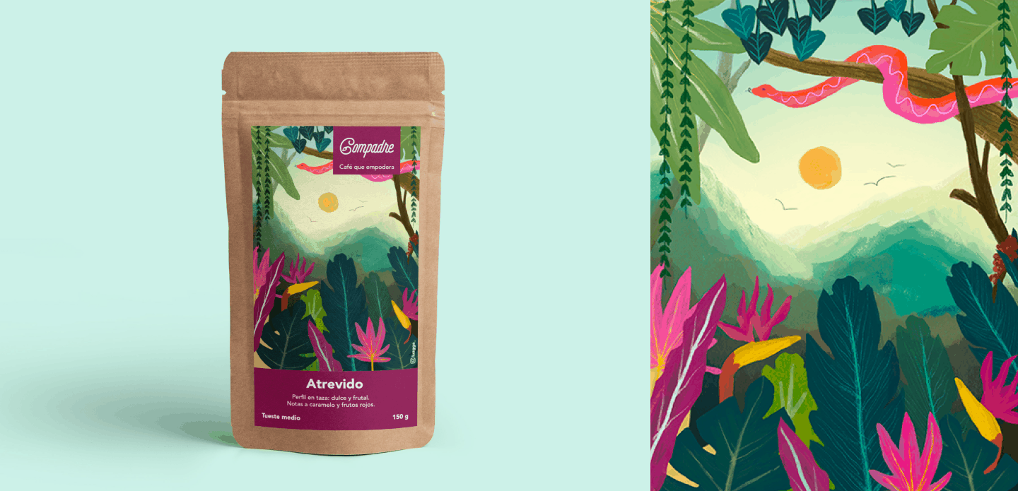 Diseñé varios empaques para Compadre, una marca de café peruana, con ilustraciones que destacan la fuerte conexión de la marca con la naturaleza y su espíritu lúdico.
